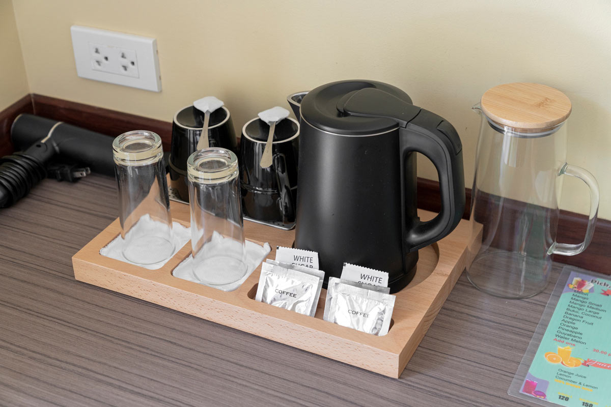 28 square meters of bright and comfortable private bedroom space with large floor-to-ceiling windows. All King rooms are fitted with a first class King Size bed ideal for couples on a romantic holiday in paradise. The large windows offer views of the surrounding mountains and the wild scenery as well as the town below. Experience the peace and healing power of the natural environment of El Nido while enjoying the comfort and convenience of our Deluxe King Rooms situated in the heart of El Nido town. The perfect accommodation for your vacation in paradise. Each room is complete with a kettle, complimentary coffee and tea, air conditioning and a TV.